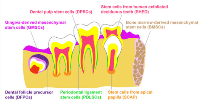 Dental Pulp Stem Cells (pulp, vases, nerves, dentine, bone); Periodontal ligament stem cells; Root apical papilla stem cells; Dental follicle stem cells (cementum, periodontal ligament, alveolar bone, whole tooth regeneration).