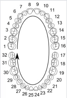 The maxillary teeth are the maxillary central incisors (teeth 8 and 9 in the diagram), maxillary lateral incisors (7 and 10), maxillary canines (6 and 11), maxillary first premolars (5 and 12), maxillary second premolars (4 and 13), maxillary first molars (3 and 14), maxillary second molars (2 and 15), and maxillary third molars (1 and 16). The mandibular teeth are the mandibular central incisors (24 and 25), mandibular lateral incisors (23 and 26), mandibular canines (22 and 27), mandibular first premolars (21 and 28), mandibular second premolars (20 and 29), mandibular first molars (19 and 30), mandibular second molars (18 and 31), and mandibular third molars (17 and 32). Third molars are commonly called "wisdom teeth" and may never erupt into the mouth or form at all.