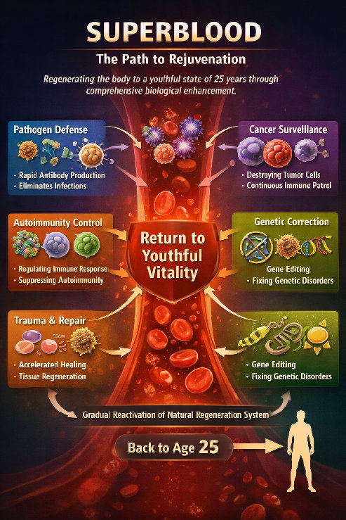Super-Blood increases quantity, quality performance of blood components to eliminate/cure virus, bacteria, cancer, toxin, trauma, aging, regenerating body and extending life forever. Blood/Skin cells can be cultured to create Superblood/Superskin that allow unlimited young interior blood, organ, tissue health, exterior skin appearance and Life extension. Blood must be self-donated for C-Life Cubic Cell Culture Super-Blood, trehalose cryo flash dry frozen and Individual Universal Immunoregeneration Blood Bank.
