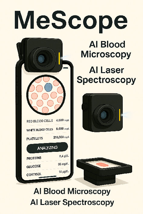 MeScope is an individual Human Artificial Intelligence Microfluid Analysis Microscopy and Spectroscopy system. Smart cellphone accessories micro-nano-spectro-scope lens-sensors that turn it into a micro-nano testing individual home-office laboratory. Smart cell phone video camera attachment for skin extract, blood, sweat, saliva, urine, micro-fluids reacting analyzing strips. A medical micro-nano-spectro-scope analyzer with Human Artificial Intelligence image enhancement computerized analysis.