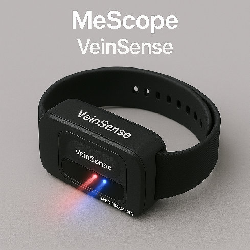 Flexible wristband or adhesive skin patch placed over the radial vein of wrist or median cubital vein or inner elbow. Biocompatible silicone material with embedded optical sensors, minimal LED strip or bluetooth sync display for smartphone app.
